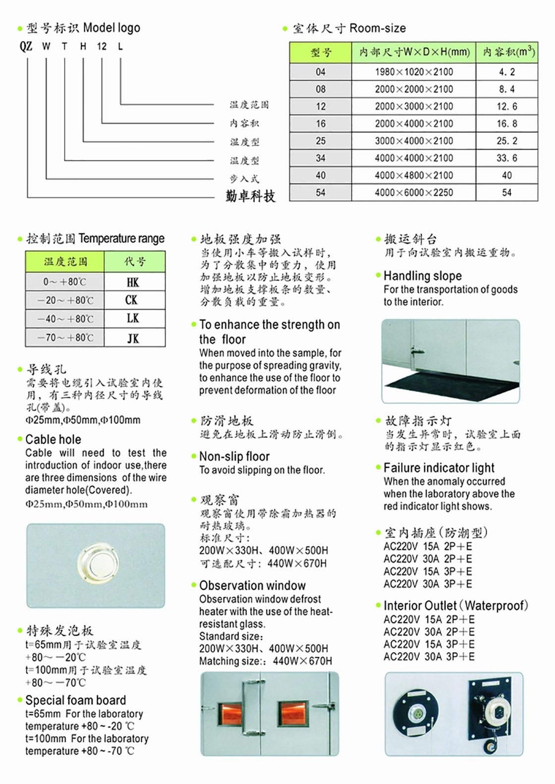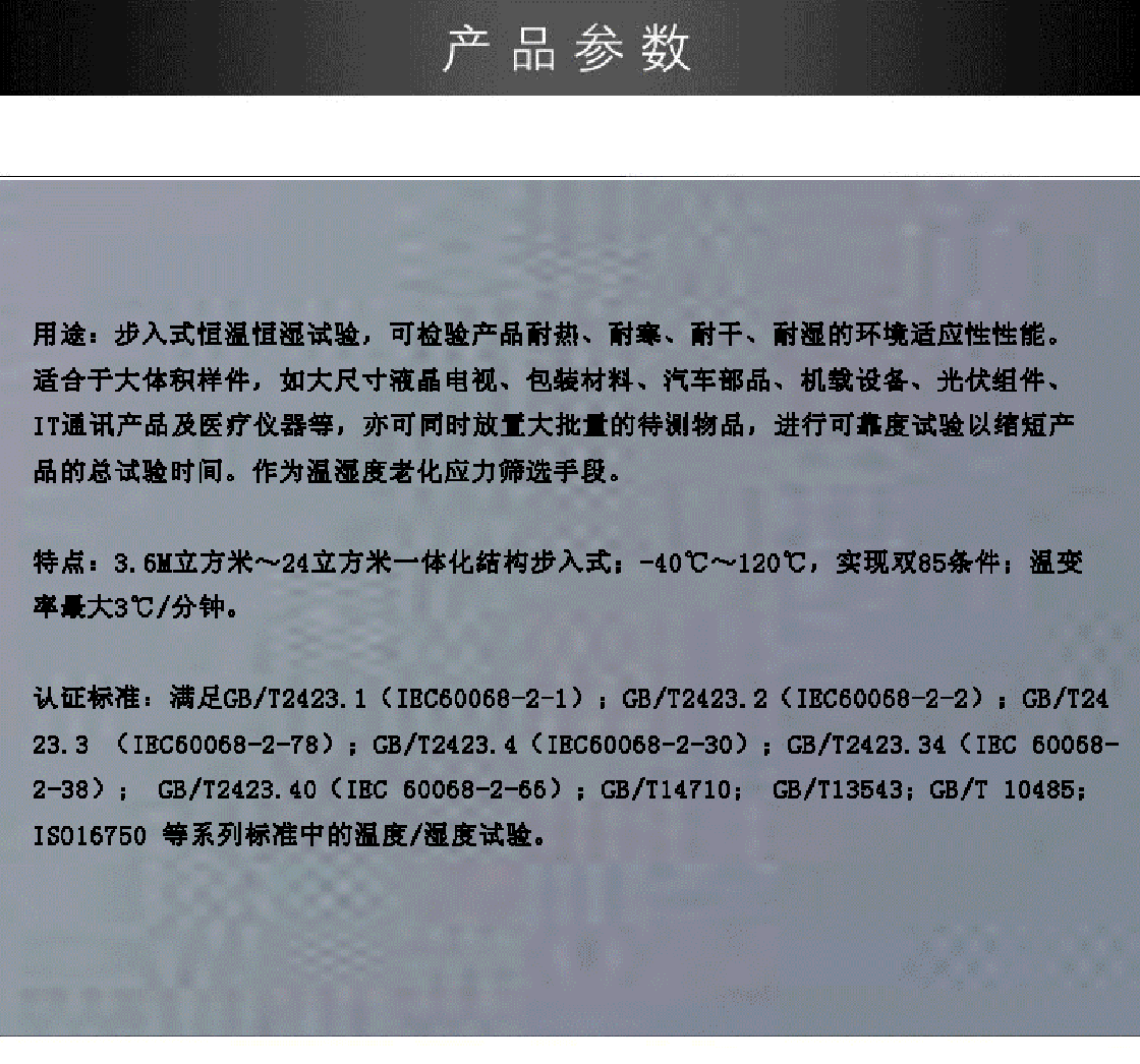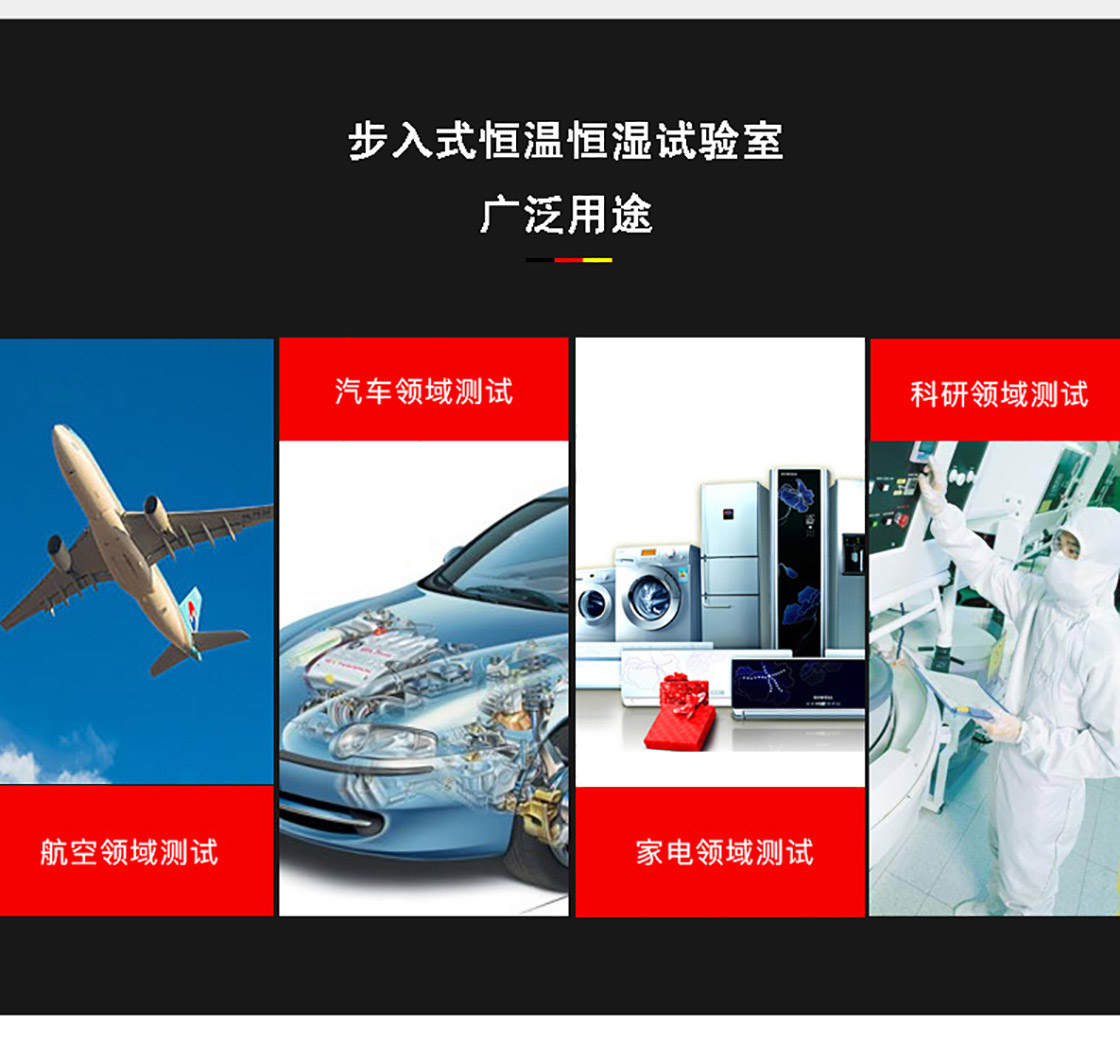 步入式試驗箱應用于國防工業、航天工業、自動化零組件汽車部件、電子電器件、塑膠、化工、制藥工業及相關產品之耐熱、耐寒測試,為產業界提供大型零件,半成品,成品之大型溫濕度測試環境空間,適合于測試產品量多、體積大之試驗設備。