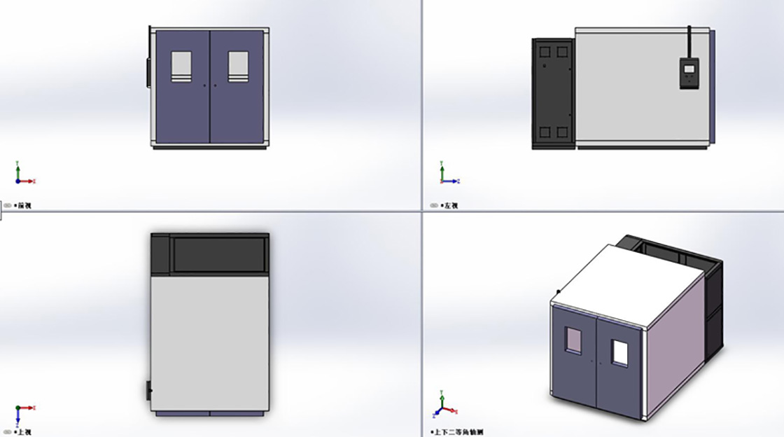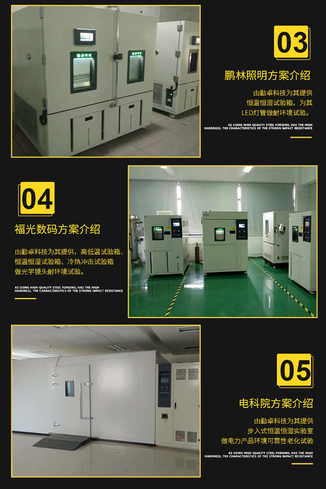 步入式試驗箱應用于國防工業、航天工業、自動化零組件汽車部件、電子電器件、塑膠、化工、制藥工業及相關產品之耐熱、耐寒測試。