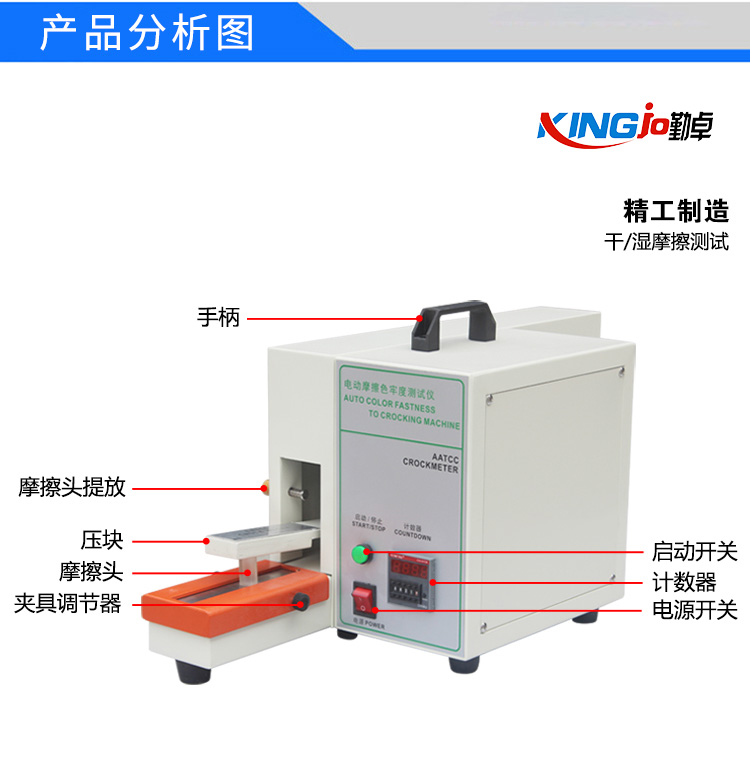 本儀器為整體式設計,主要由底座、摩擦傳動機構和計數器組成,用試樣夾將試樣和砂紙固定在底座的一側,搖動手柄使裝有白棉布的摩擦頭在試樣上作規定行程的往復運動,使白棉布和試樣相互摩擦,摩擦十次后觀察并用灰卡對比評定白棉布上的粘色程度,對織物試樣的染色或表面涂層的穩定性作出評判,為材料的評估和選擇提供參考數據。本儀器適用于紗線、色織、印染等紡織品以及玩具產品上或其內部的所有織物。