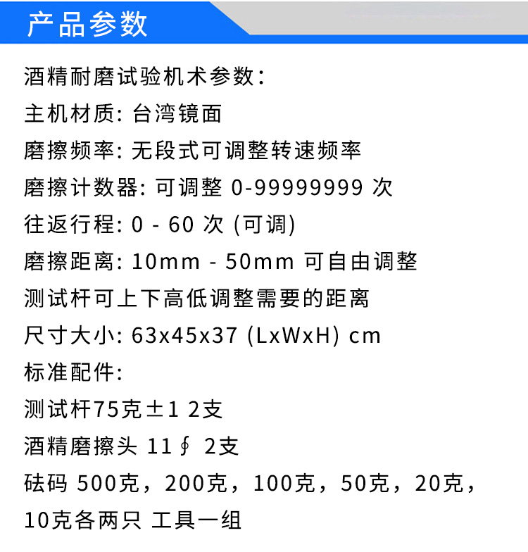 酒精耐磨試驗(yàn)機(jī)技術(shù)參數(shù):主機(jī)材質(zhì): 臺(tái)灣鏡面磨擦頻率: 無段式可調(diào)整轉(zhuǎn)速頻率磨擦計(jì)數(shù)器: 可調(diào)整 0-99999999 次往返行程: 0 - 60 次 (可調(diào))磨擦距離: 10mm - 50mm 可自由調(diào)整測試桿可上下高低調(diào)整需要的距離尺寸大小: 63x45x37 (LxWxH) cm標(biāo)準(zhǔn)配件:測試桿75克±1 2支